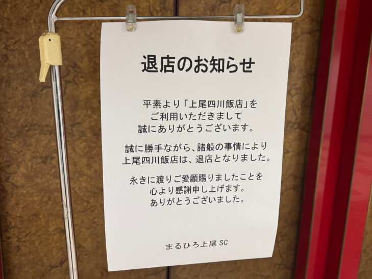 同じくまるひろ6階の上尾四川飯店が閉店していました。